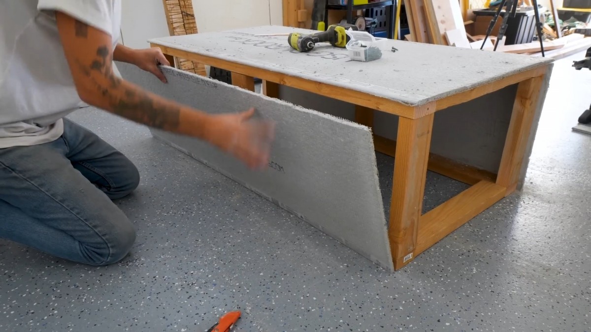 Boční panel se přikládá na konstrukci a začíná uzavírat celý objem stolu