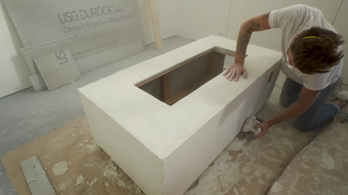 Povrch po první vrstvě malty je ještě hrubý, ale základní tvar stolu je hotový