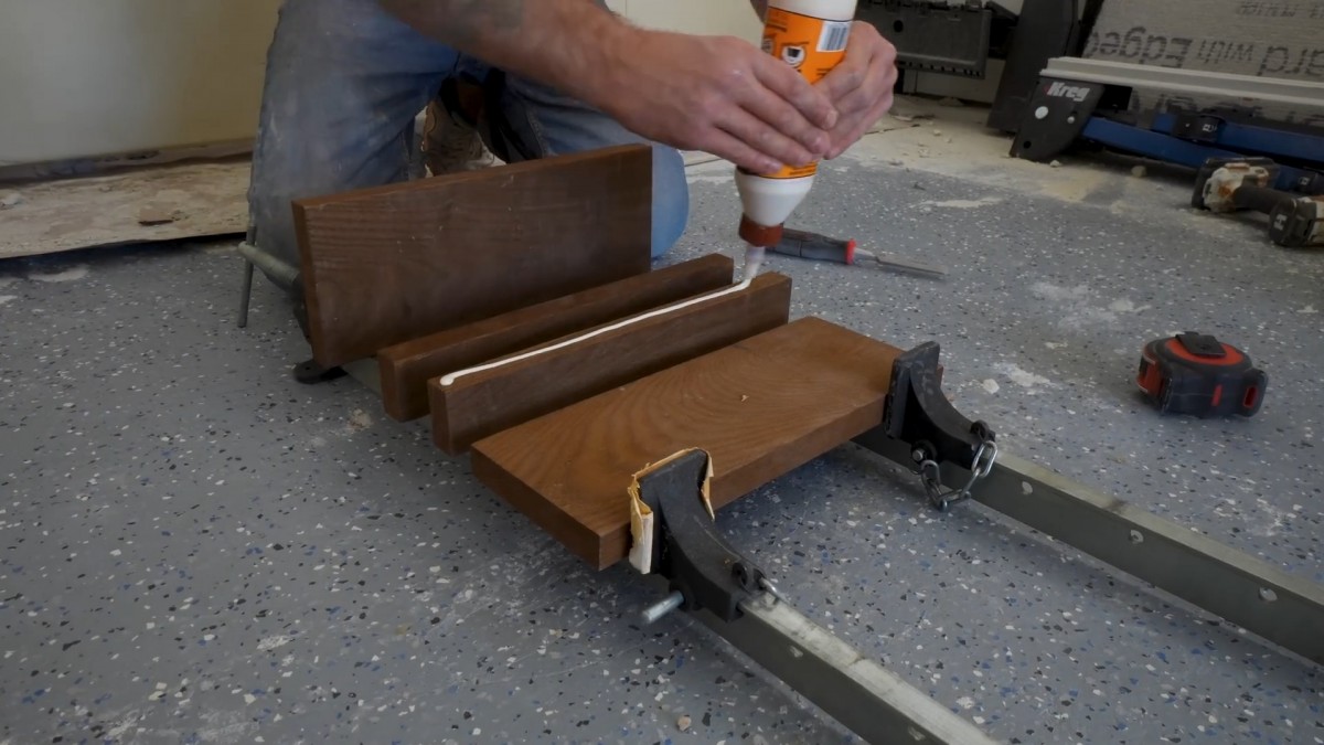 Lepení dřevěných prken do jednoho panelu, ze kterého vzniknou dvířka pro propanovou láhev