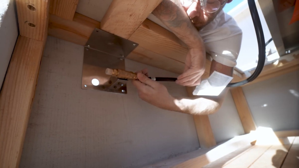 Napojení plynové hadice na ventil a regulátor uvnitř konstrukce, kde je celý systém bezpečně ukrytý