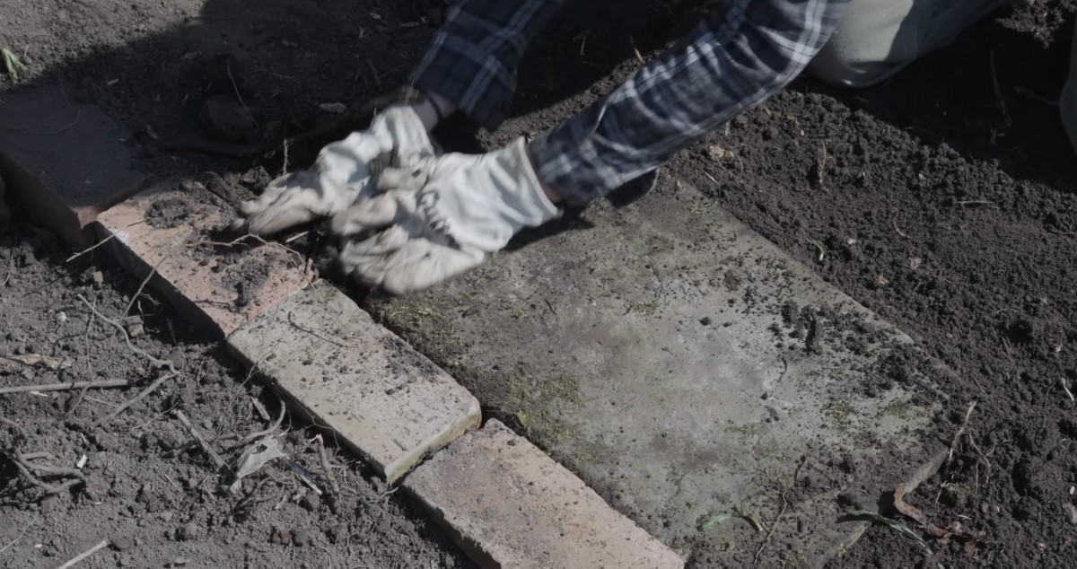 Dno budoucího skleníku nejprve vyrovnala zeminou a do středu položila kamenné dlaždice, které později vytvořily praktickou chodníkovou cestičku