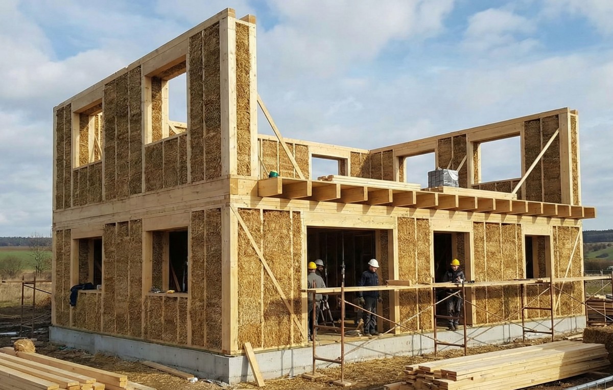 Takto vypadá rozestavěný dům z slaměných panelů, které slouží současně jako konstrukční systém i jako izolace