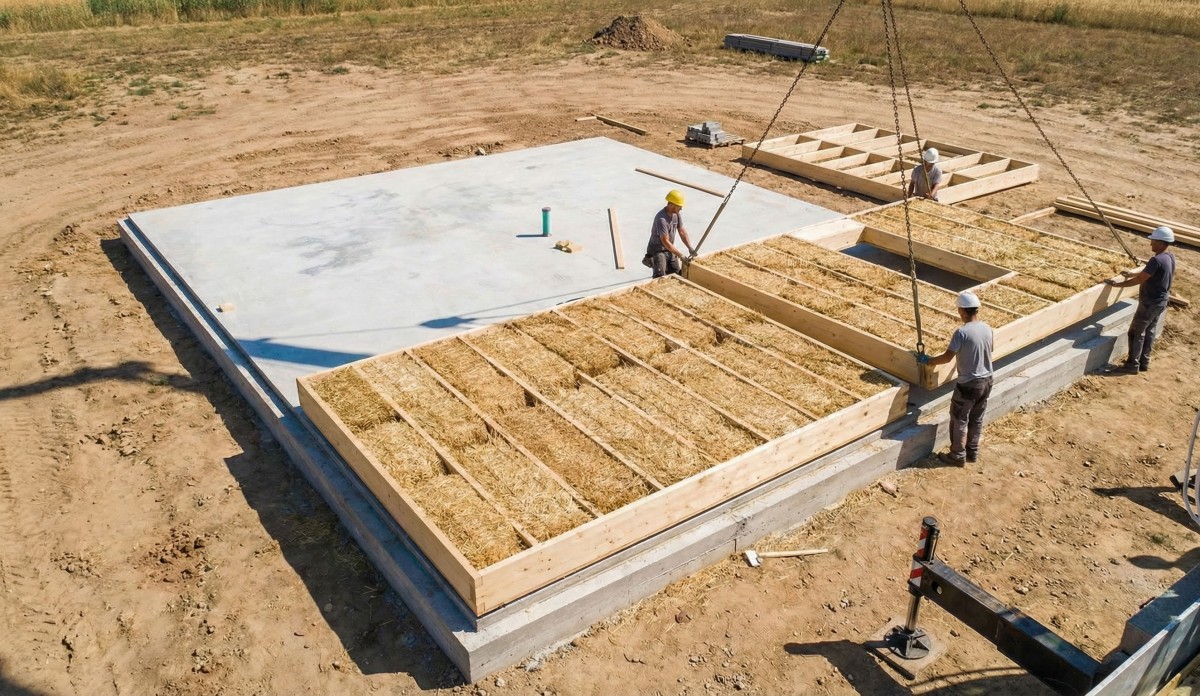 Prefabrikované slaměnné panely se dovezou na místo, kde se začnou zvedat a montovat přímo na základové desce