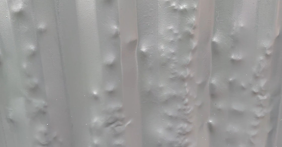 Tyto promáčkliny na stěně jsou běžnou stopou po manipulaci a přepravě kontejneru a samy o sobě neznamenají konstrukční problém