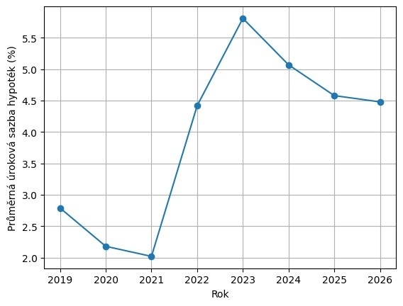 Vývoj průměrných úrokových sazeb nových hypoték v Česku v letech 2019–2026. Po historickém minimu kolem 2 % v roce 2021 sazby prudce vzrostly a v roce 2023 přesáhly 5 %