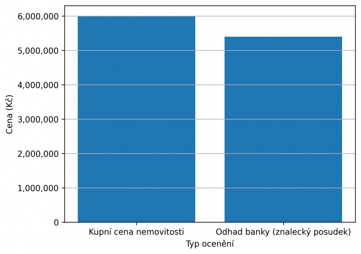 Srovnání kupní ceny nemovitosti a odhadu banky podle znaleckého posudku. Pokud je odhad nižší než kupní cena, banka může poskytnout nižší hypotéku a kupující musí doplatit větší část z vlastních úspor