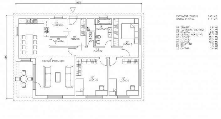Na užitné ploše 114 metrů čtverečních se nachází deset místností (tři ložnice, obývací pokoj propojený s kuchyní, spíž, technickou místnost...)