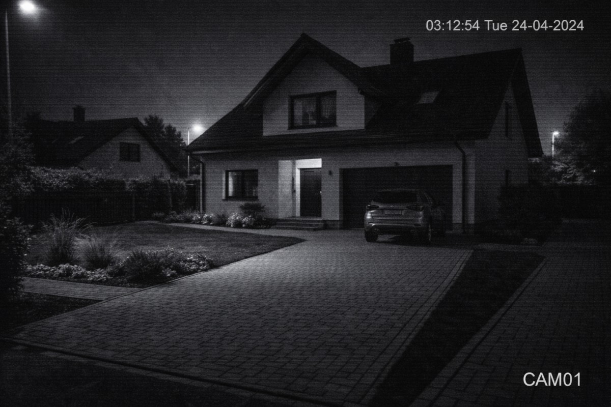 Noční záběr domu ze záznamu kamery, který zachytil podezřelý pohyb. Právě tento důkaz později vedl k dopadení pachatele, ale paradoxně i k tomu, že majitel platil