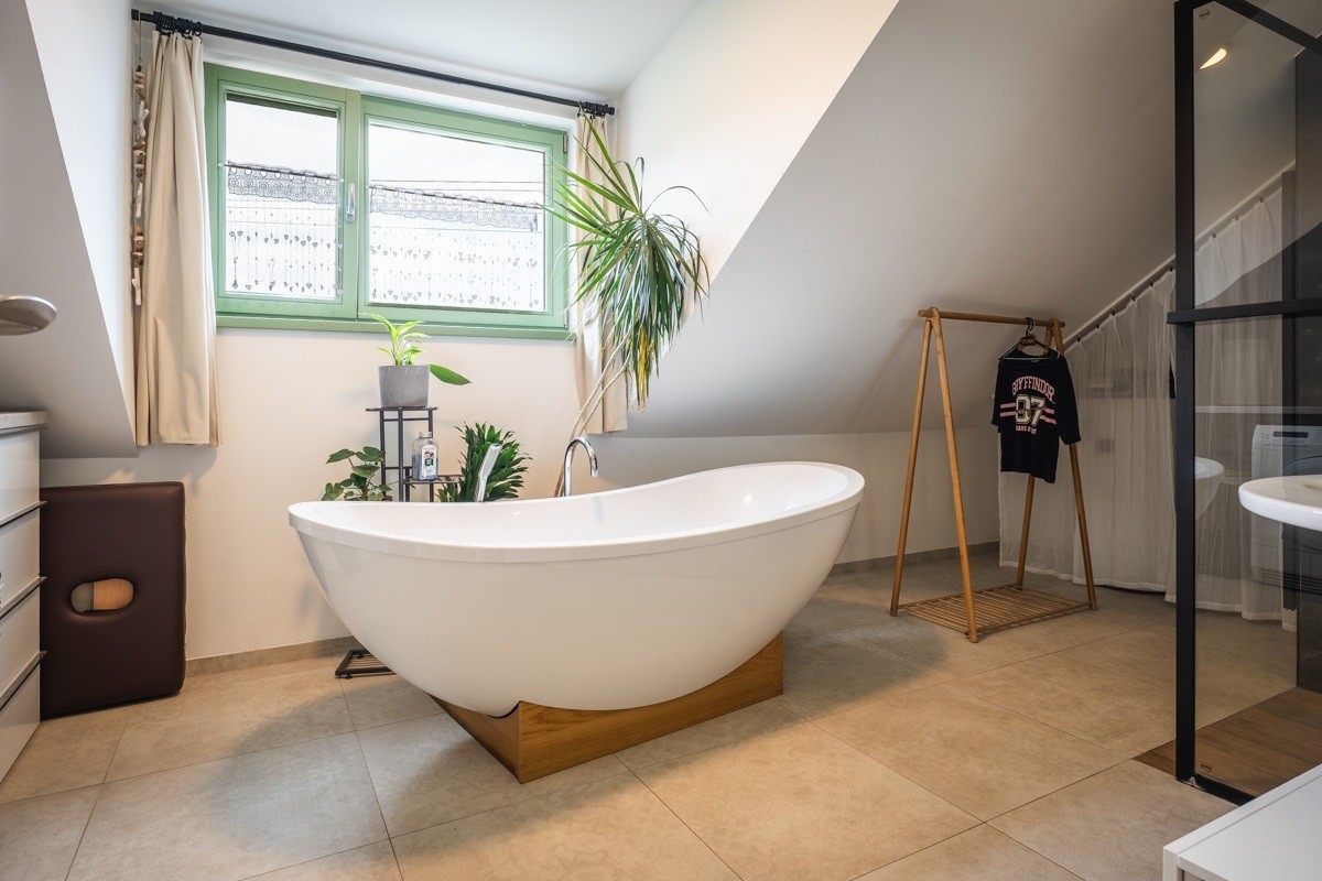 V patře se nachází také velmi prostorná koupelna se samostatně stojící vanou