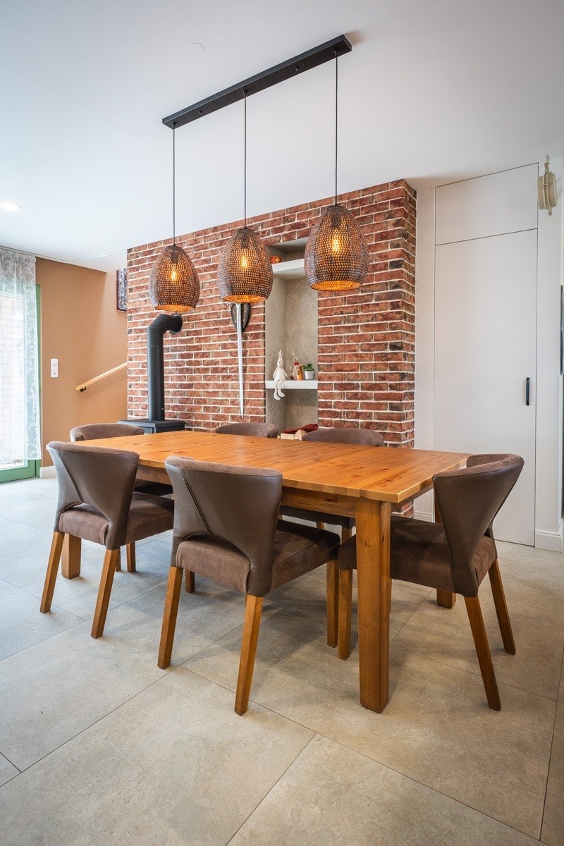 V jídelně najdeme masivní dřevěný stůl se šesti židlemi, nad kterým visí designový lustr