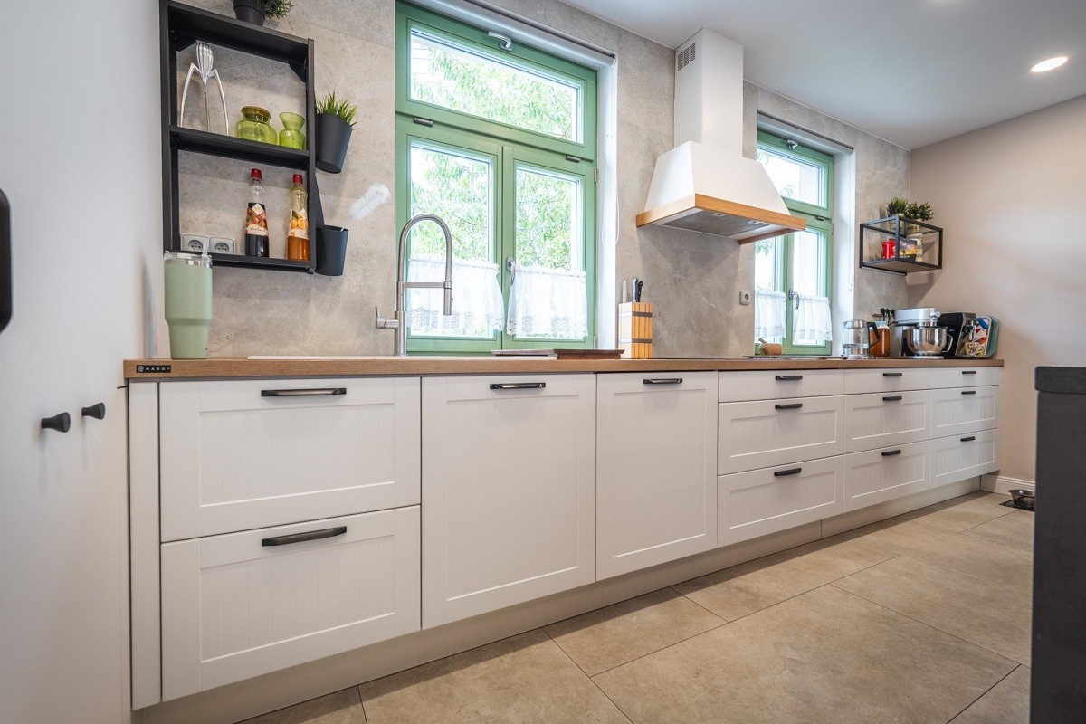 Kuchyně je dostatečně světlá díky bílé kuchyňské lince a dvěma oknům. Ta vedou na ulici