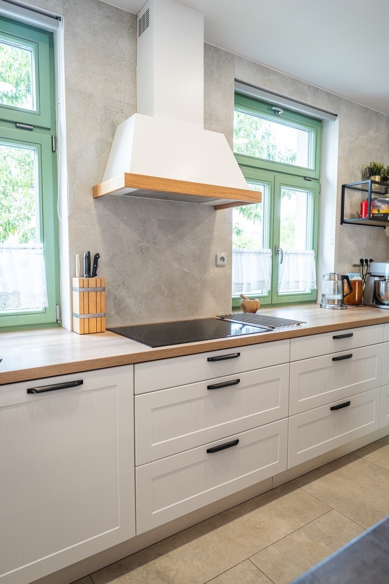 Výrazným prvkem v kuchyni je digestoř s dřevěným lemem