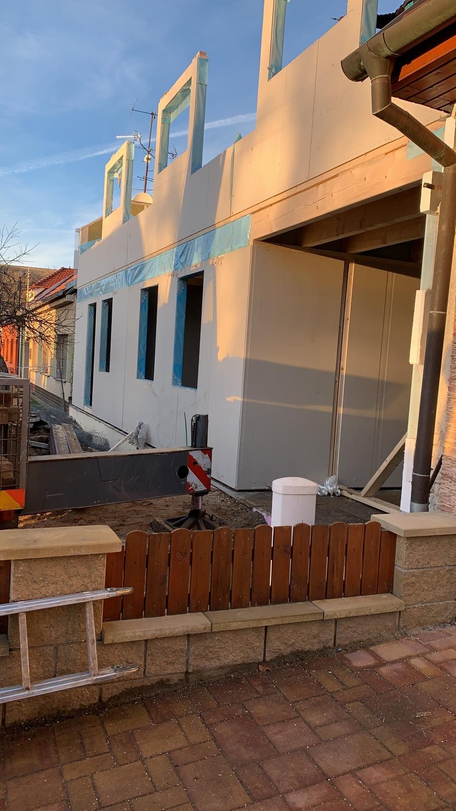 Na fotce je nově postavená hrubá stavba domu, kde už stojí přízemí a začínají být vidět obrysy horního patra