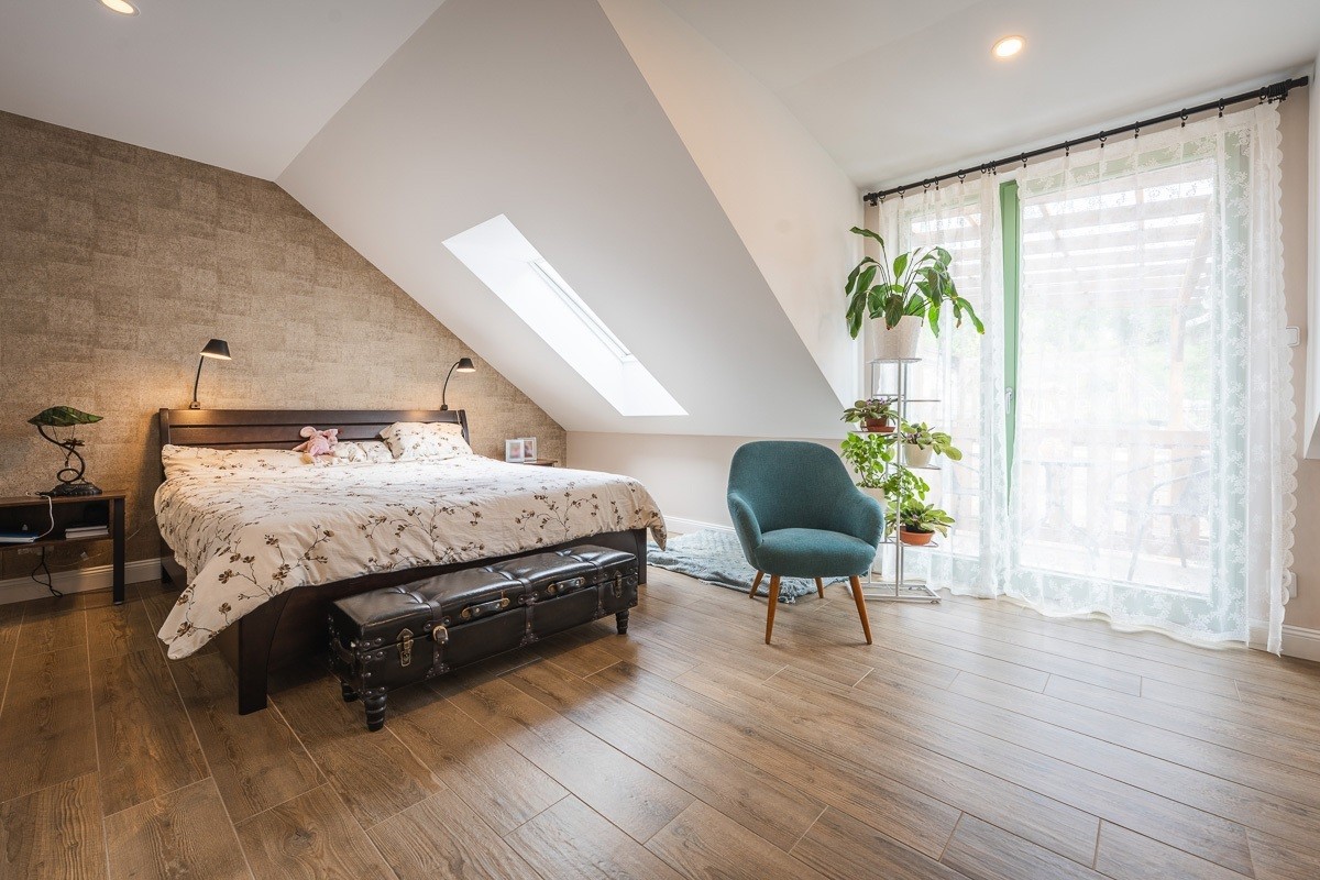 Dalším pokojem v patře je ložnice majitelů dřevostavby. Jak můžete vidět, je dostatečně prosvětlená