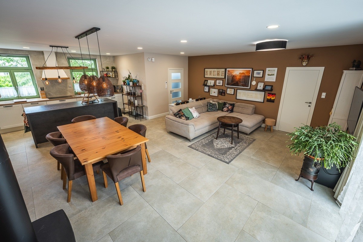 Obývací pokoj, jídelna a kuchyně je propojená v jednom velkém prostoru