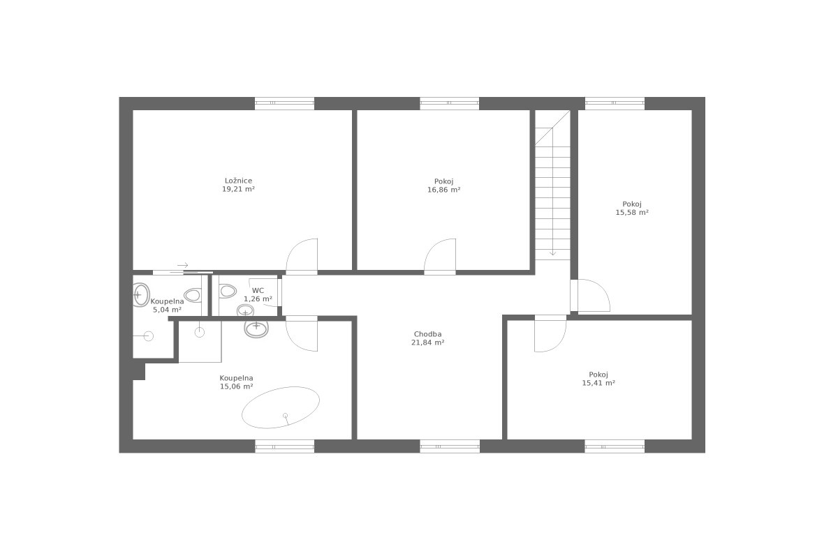 Ve středu druhého nadzemního podlaží je prostorná chodba, ze které vedou dveře do jednotlivých pokojů
