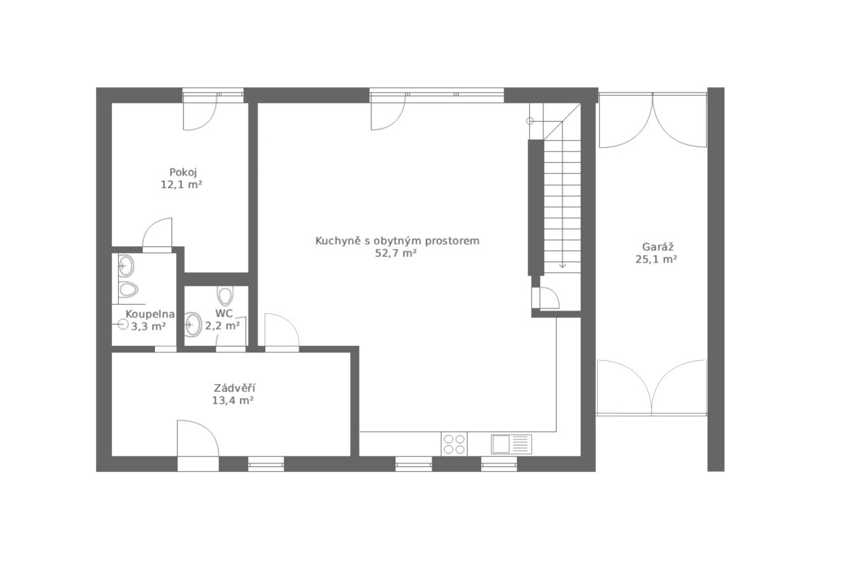Na fotografii můžete vidět první nadzemní podlaží rodinného domu s celkovou dispozicí 6+kk