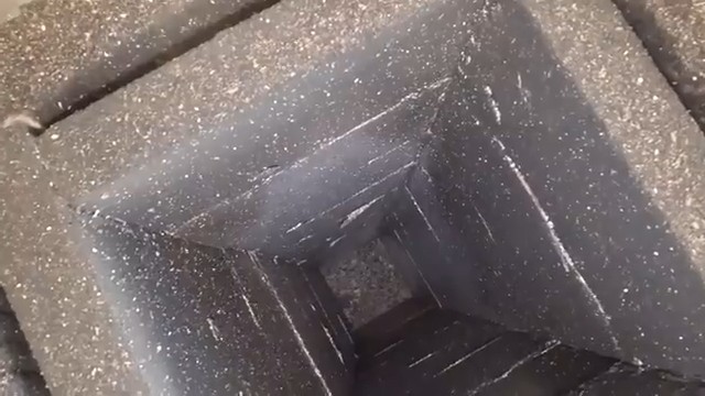 Pohled do izolované spalovací šachty ukazuje úzký kanál, kde díky silnému komínovému tahu a vysoké teplotě dochází k téměř dokonalému spalování plynů i sazí
