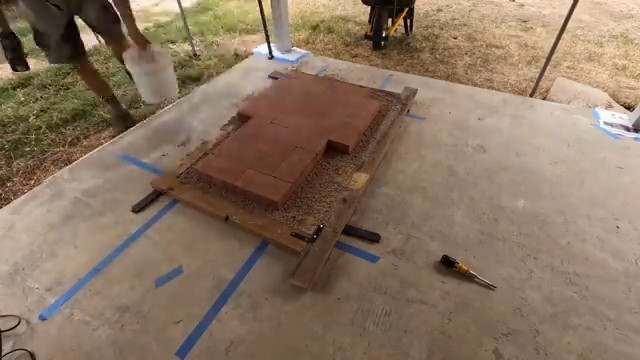 Stavitel přesně vytyčil půdorys budoucích kamen na betonové desce a vyskládal první vrstvu šamotových cihel, která určuje trasu spalovacího kanálu i budoucí lavice