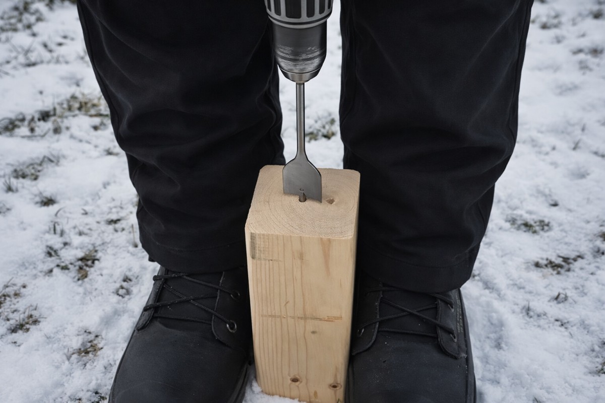 Nejprve vyvrtáme otvor z horní strany polene o průměru přibližně 3 cm