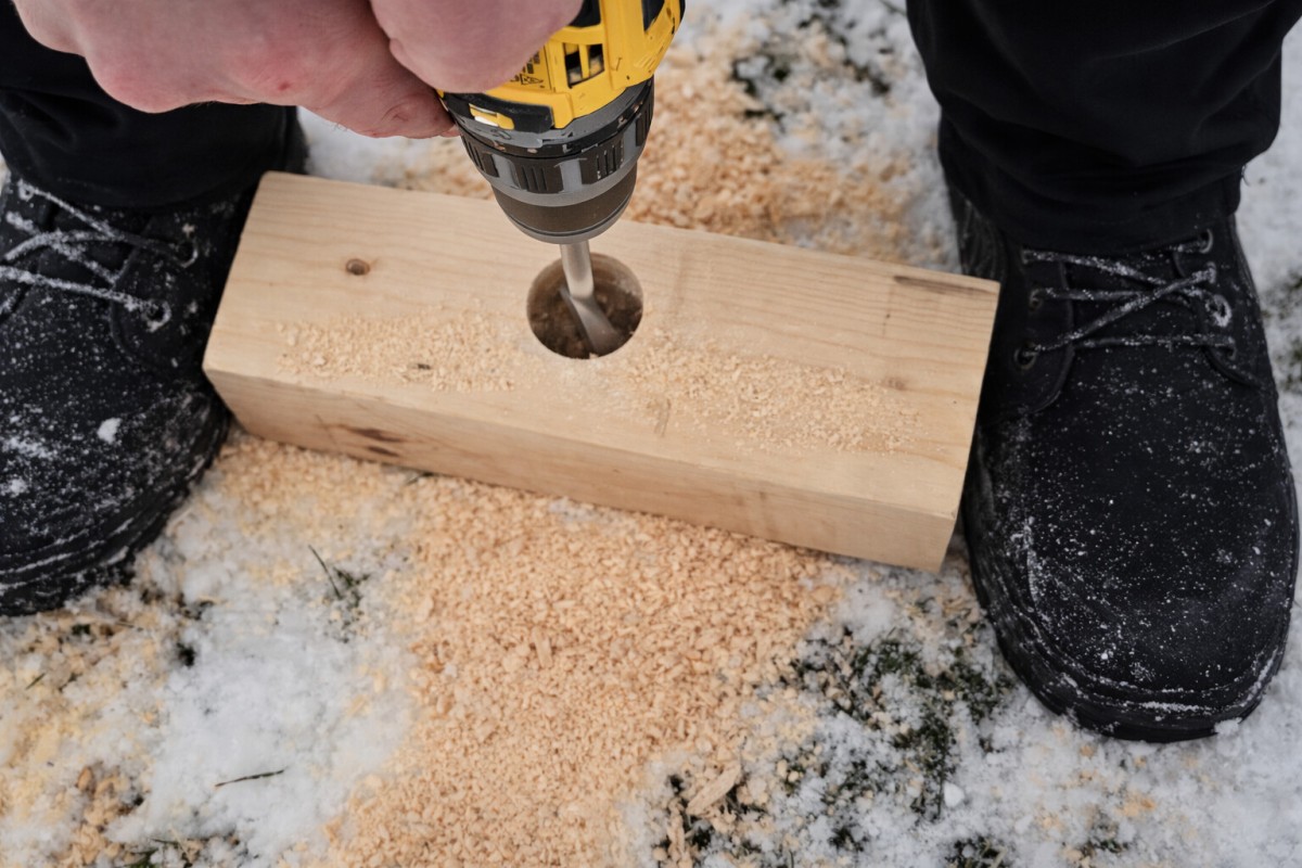Nyní provedeme stejný vrt z boku hranolu tak, aby se oba vrty potkaly a vytvořily otvor tvaru L