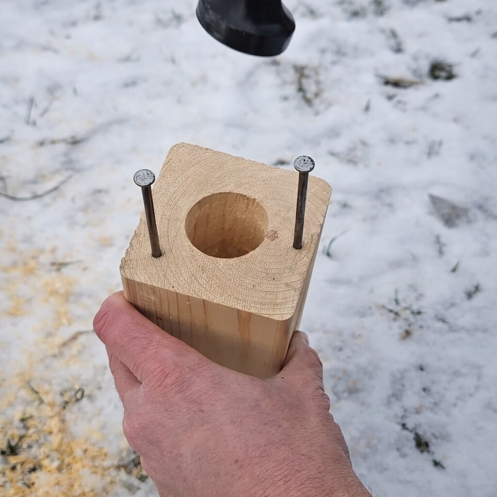 Do horní strany hranolu zatlučeme 3 hřebíky rovnoměrně tak, aby na ně šel postavit hrnec