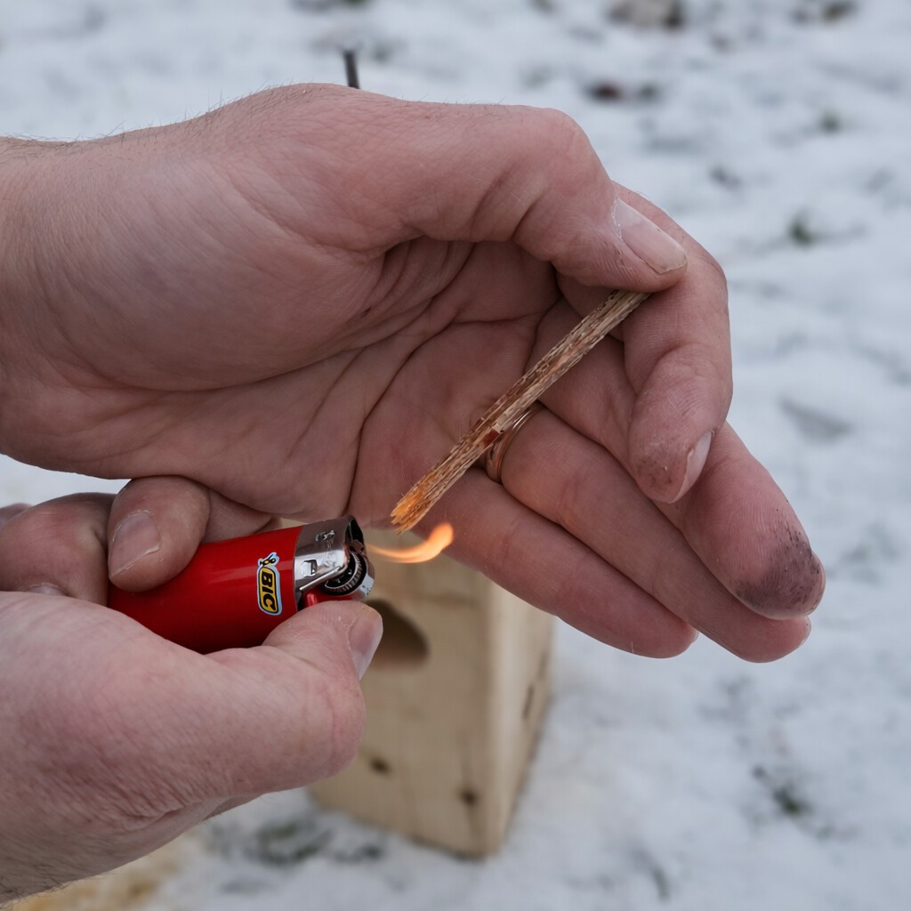 Zapálíme vyrobená kamna pomocí kousku dřeva nebo suché trávy. Lze použít i větvičky či podpalovač