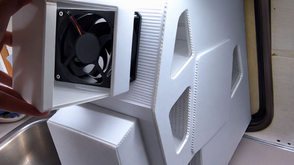 Zatímco první čtverec měl vnitřní dutinky orientované zleva doprava, druhý je měl natočené zepředu dozadu, třetí zase zleva doprava a tak dále. Takto navrstvil sloupce až do konečné výšky zhruba 18 centimetrů. Tímto naprosto triviálním a neuvěřitelně levným způsobem vytvořil plnohodnotný křížový výměník tepla s obrovskou předávací plochou. Vzduch tak může jádrem proudit vodorovně i svisle skrz nespočet malých úzkých trubiček, aniž by se oba proudy kdykoliv fyzicky setkaly a smíchaly. Po slepení celého bloku jádra vzal ještě vibrační brusku a všechny boční stěny této složené kostky velmi jemně a trpělivě zbrousil do roviny, aby jádro hladce a přesně pasovalo do již připraveného vnějšího boxu.