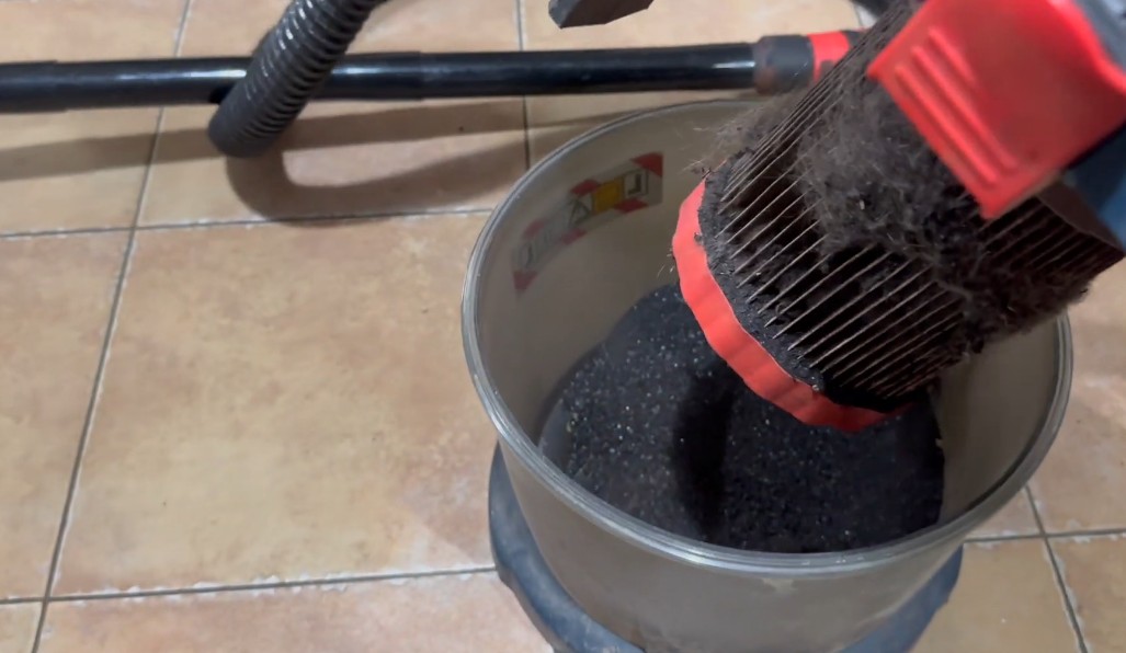 Ve vysavači se shromáždilo velké množství jemných sazí a usazenin odstraněných z komína a kamen během čištění