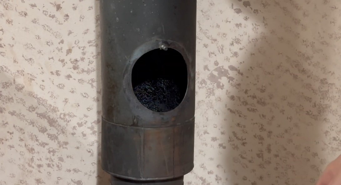 Uvnitř otevřeného kouřovodu vidíme usazené spaliny, které se nahromadily kvůli špatnému způsobu topení