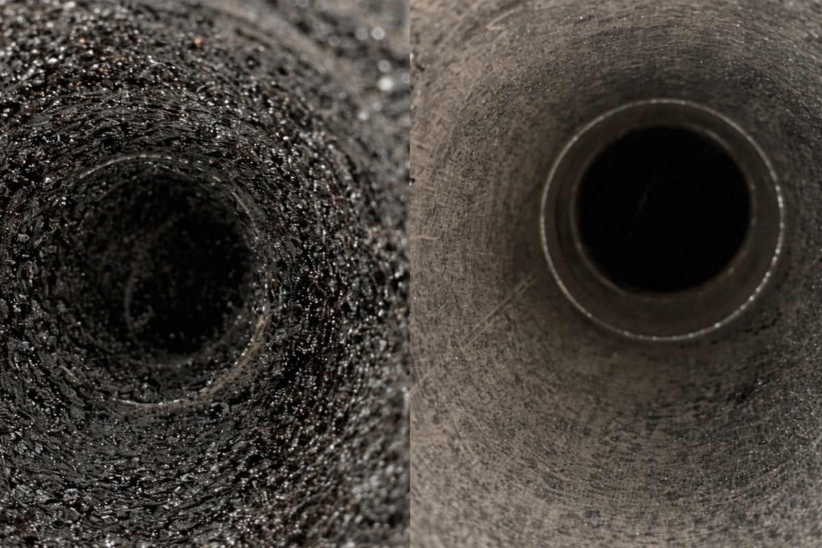 Srovnání ukazuje rozdíl mezi silně zaneseným komínem před čištěním a čistým průchodem po důkladném mechanickém vyčištění