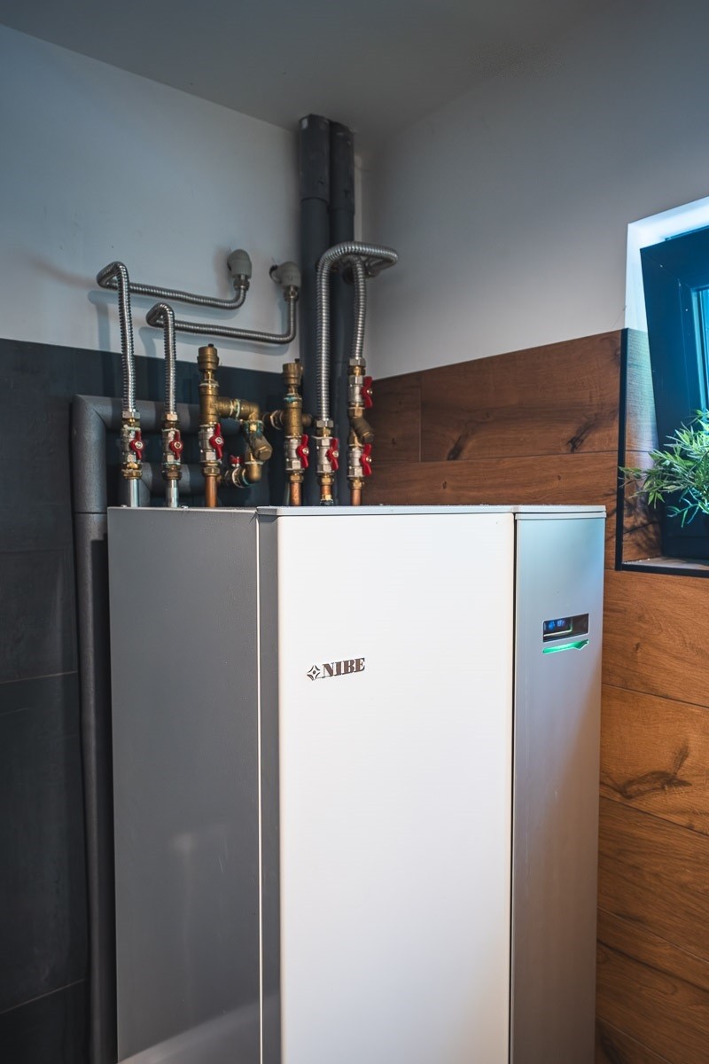 Dům je vytápěn tepelným čerpadlem vzduch–voda, které slouží i pro ohřev teplé užitkové vody