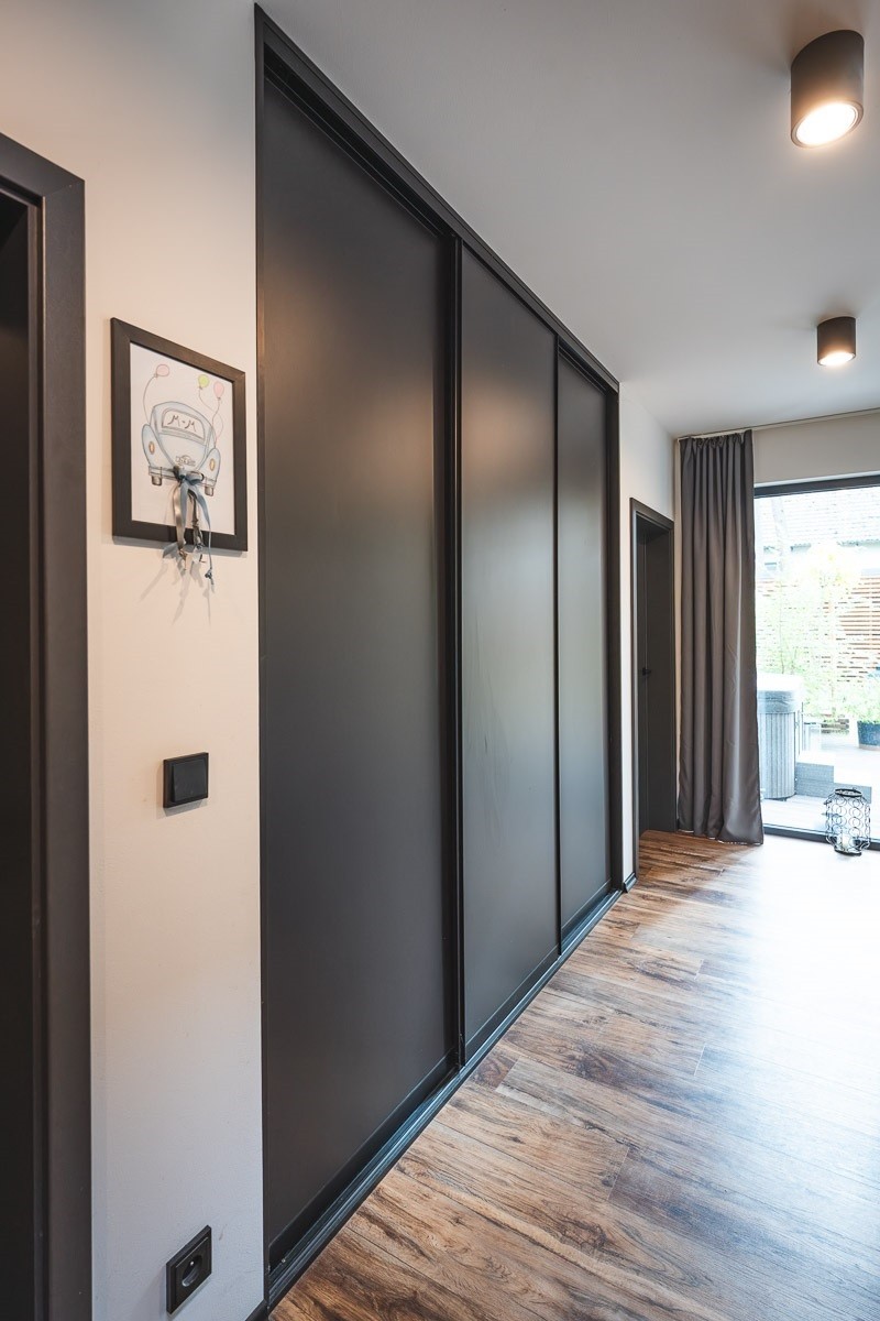 Dům má dispozici 5kk. V patře jsou ale dvě velké šatny proti sobě, velká koupelna a celkem dvě toalety. Dole je velká šatní skříň, další je i v chodbě