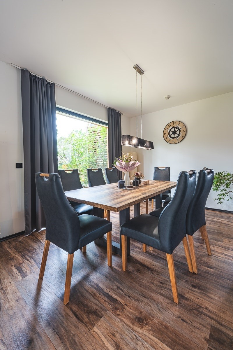 Jídelna je součástí otevřeného obytného prostoru, který tvoří společně s kuchyní a obývacím pokojem hlavní denní zónu domu