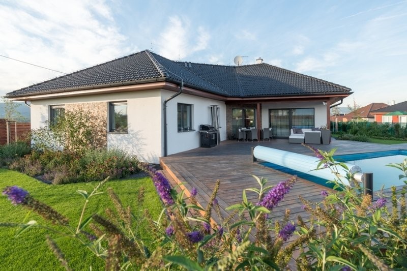 V zahradě u rodinného domu mohou mít majitelé i velkou terasu s bazénem