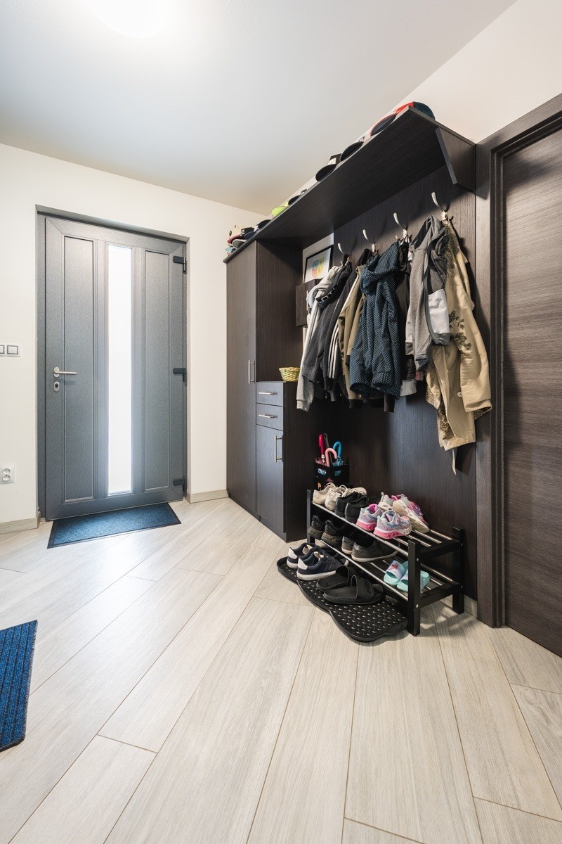 Hlavním vstupem se dostanete do prostorné předsíně s velkým úložným prostorem a navazujícími dveřmi do technické místnosti a do hlavní obytné místnosti