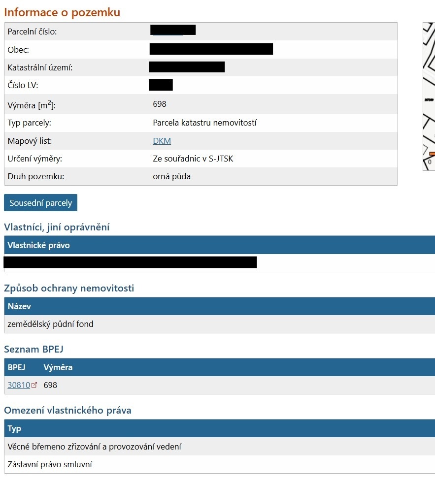 Po přihlášení zjistíte také katastrální území, které budete potřebovat pro další kroky. Samotný katastr ale neříká nic o tom, zda je na pozemku možné bezpečně a legálně stavět