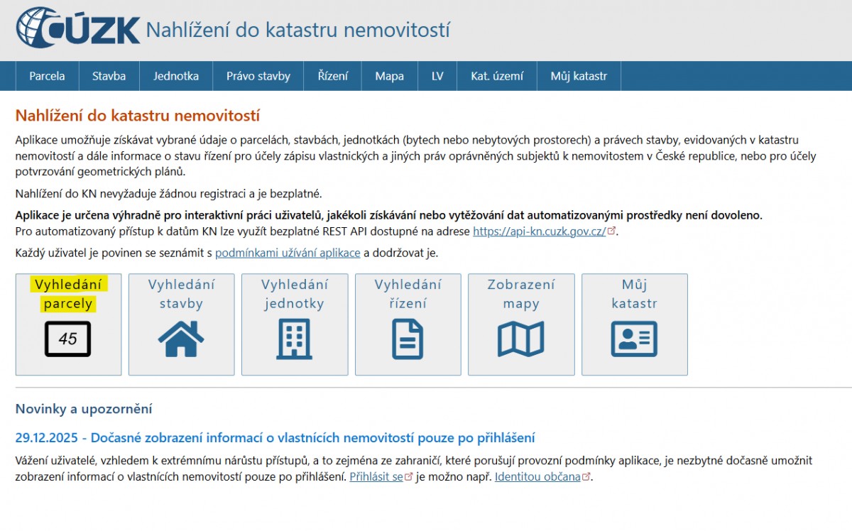 Vyhledáte zde parcelu buď podle čísla parcely, nebo podle adresy