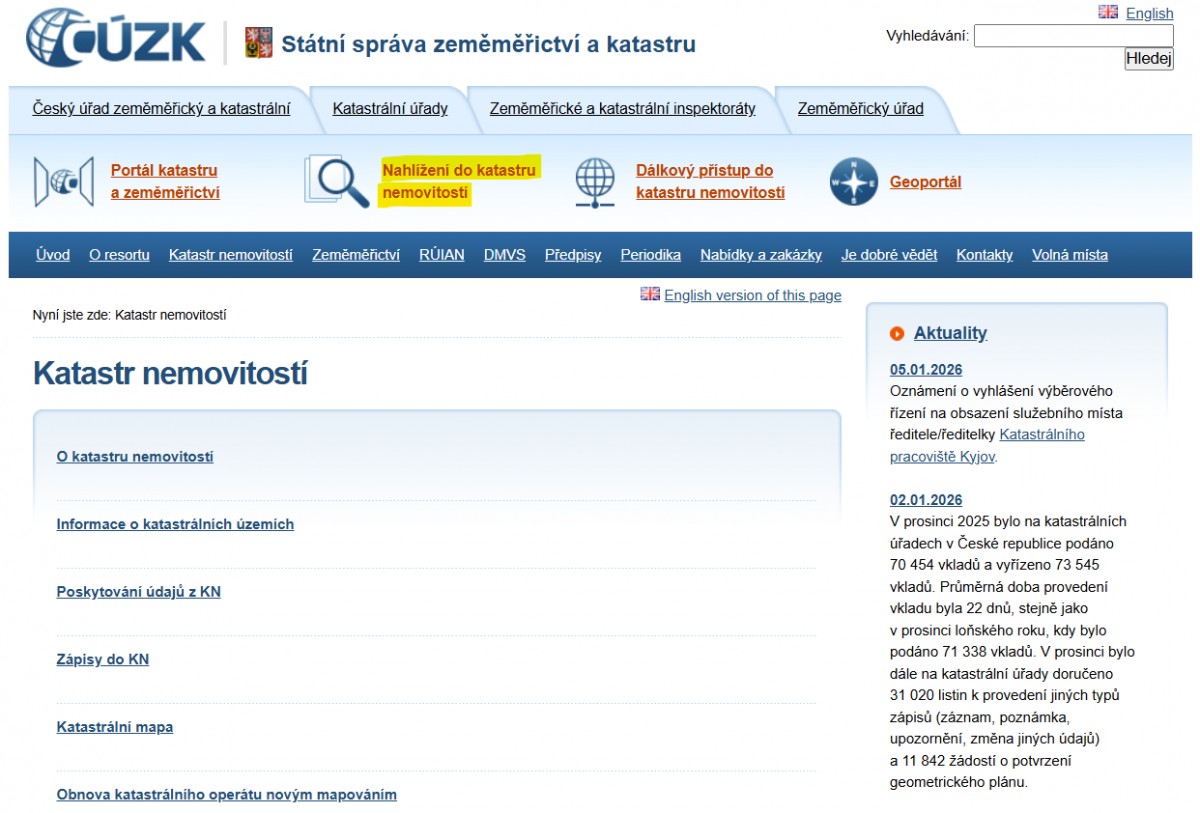 Začněte v Nahlížení do katastru nemovitostí na webu Českého úřadu zeměměřického a katastrálního