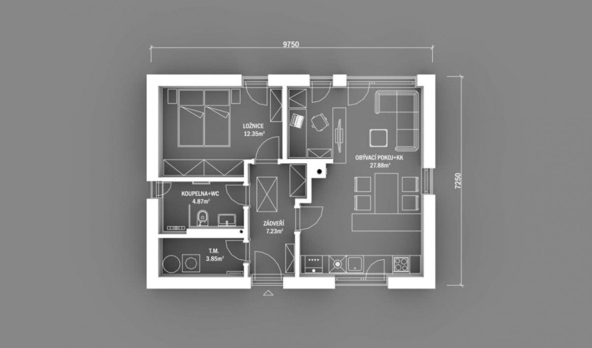 Zastavěná plocha se pohybuje okolo 70 metrů čtverečních, což znamená, že takový dům lze umístit i na menší pozemek, který by pro klasický rodinný dům nestačil