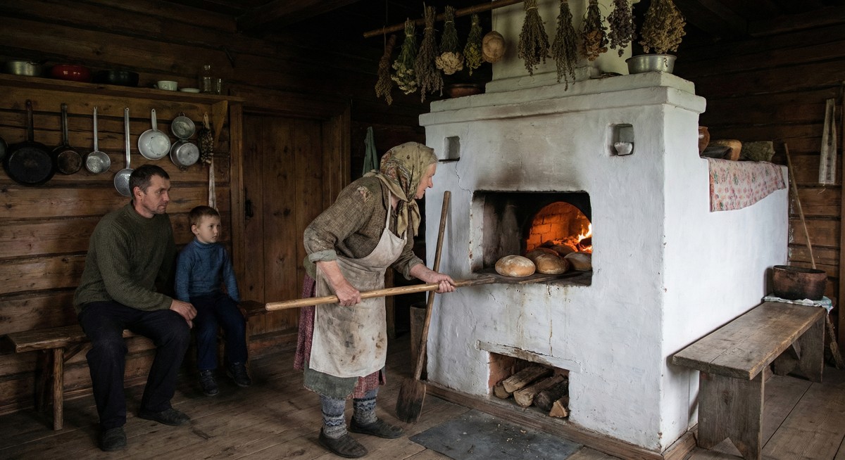 Typická scéna z ruské vesnice. Paní peče chléb v kachlových kamnech