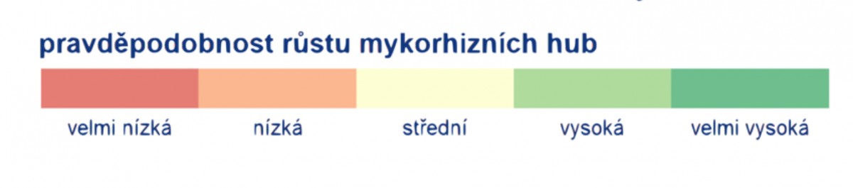 Barvy znázorňují pravděpodobnost růstu hub: Velmi nízká – tmavě červená, Nízká – oranžová, Střední – světle žlutá, Vysoká – světle zelená, Velmi vysoká – tmavě zelená. Přesnou škálu najdete na konci galerie.