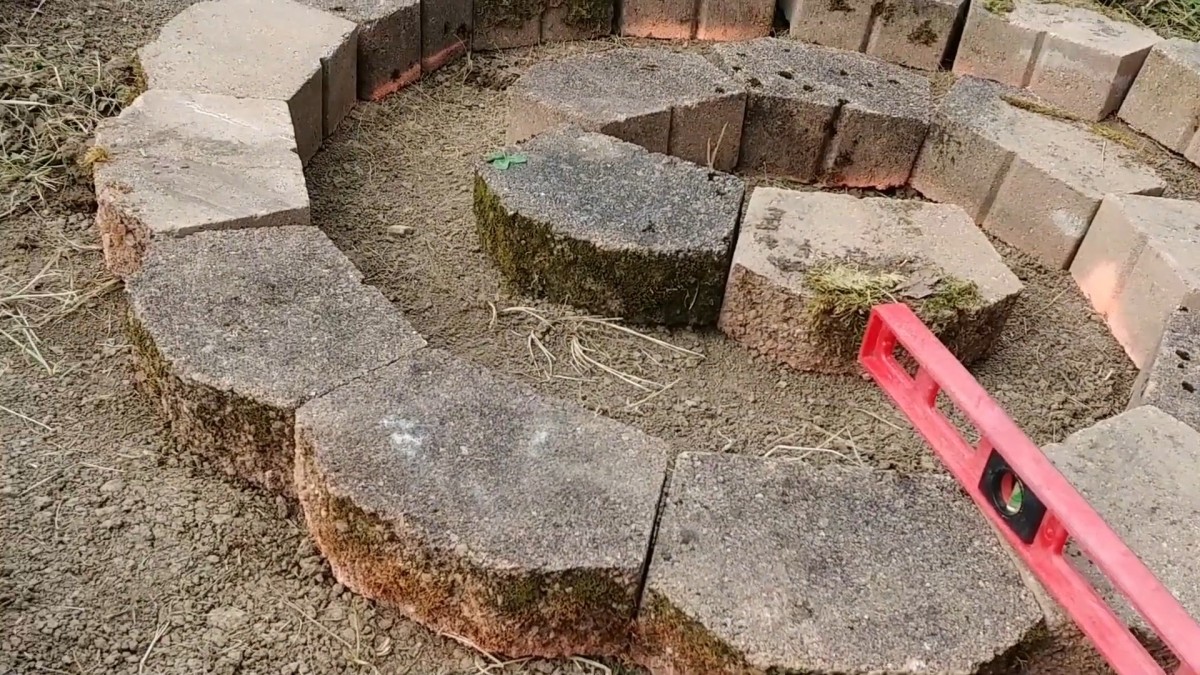 Vytváříme vnitřní část spirály a pečlivě usazujeme cihly směrem ke středu