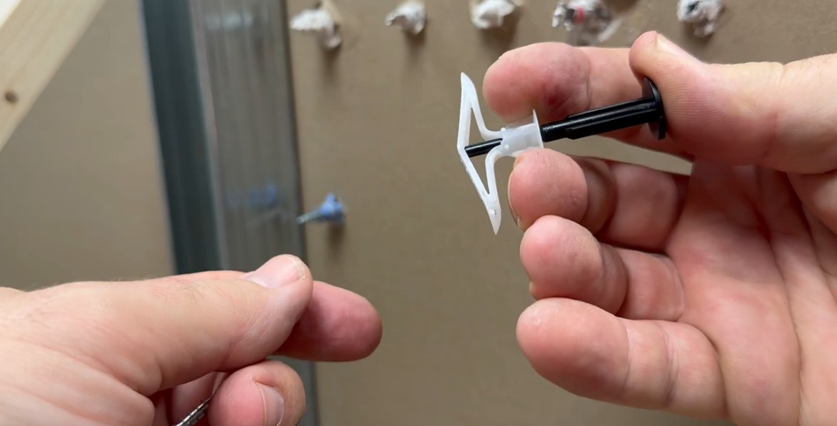 Plastová sklopná hmoždinka se zavádí do předvrtaného otvoru a po dotažení šroubu se rozevře za deskou