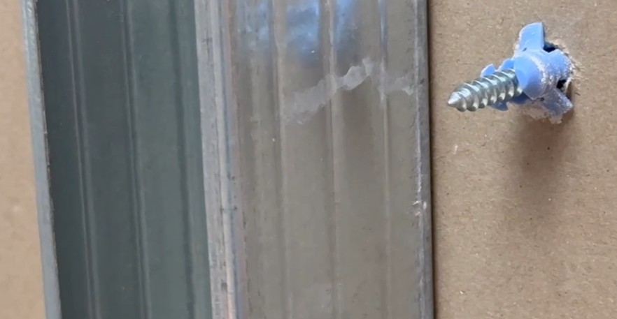 Samozávrtná plastová hmoždinka je zašroubovaná do sádrokartonu v blízkosti kovového profilu a zajišťuje lehké uchycení