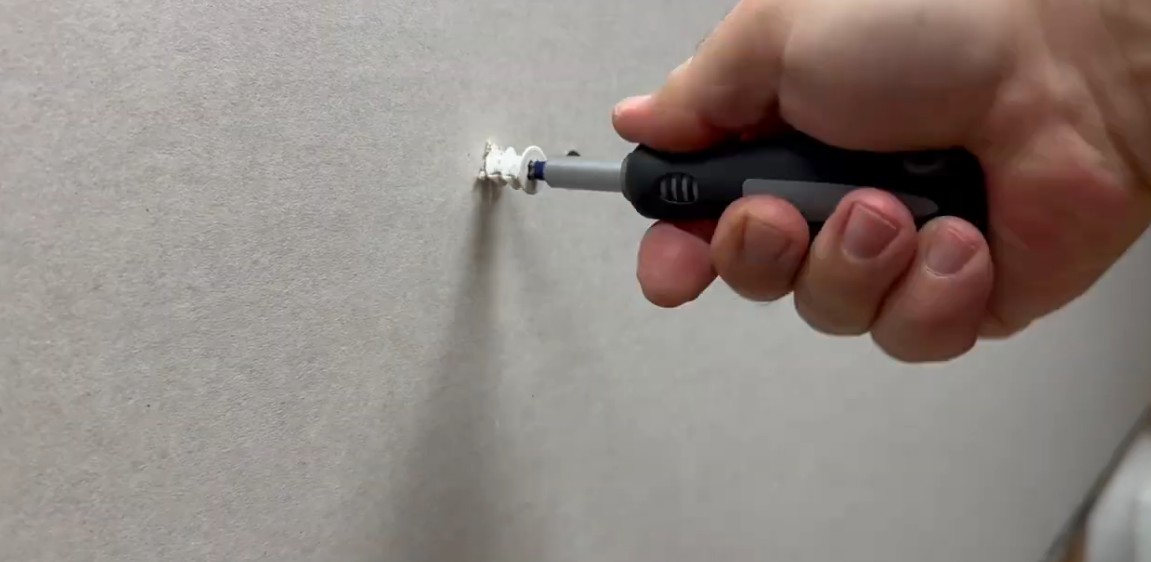 Ručním šroubovákem se instaluje samozávrtná hmoždinka do sádrokartonu bez předvrtání, přičemž správný bit zabraňuje protočení a poškození stěny