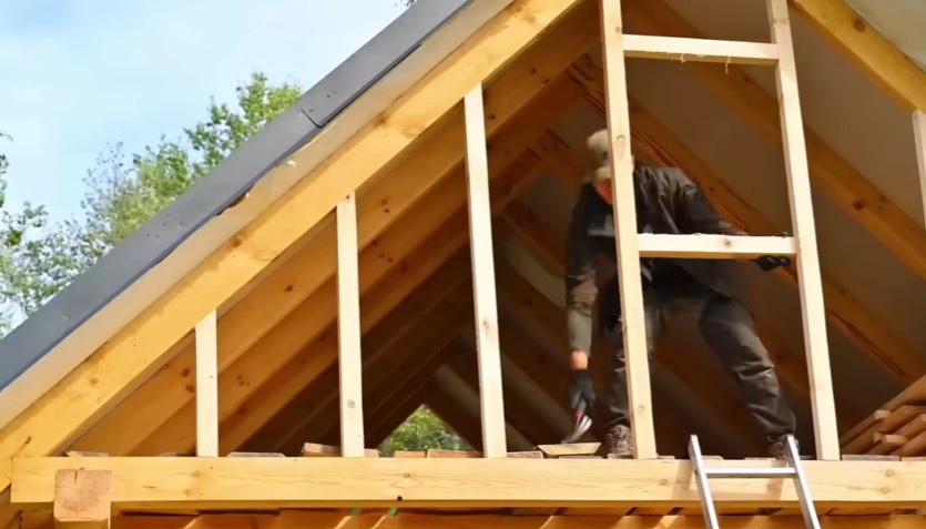 Mladík instaluje svislé dřevěné latě do štítové stěny, které vytvářejí nosnou konstrukci pro budoucí opláštění podkroví