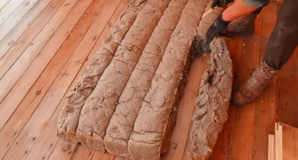 Mladík připravuje izolační materiál. Vypadá to na přírodní vláknitou izolaci (pravděpodobně lněnou nebo konopnou) ve formě lisovaných pásů