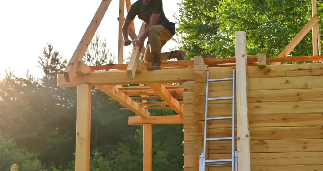 Na konstrukci střechy postupně montoval krokve, které vytvoří šikmý tvar střechy a ponesou její budoucí krytinu