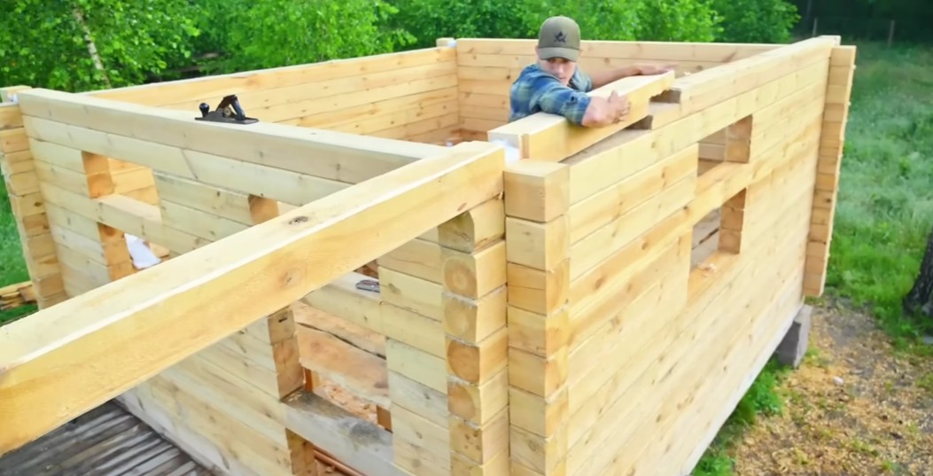 Na horní část stěn postupně pokládal dlouhé trámy, které vytvoří základ konstrukce střechy a ponesou její budoucí zatížení